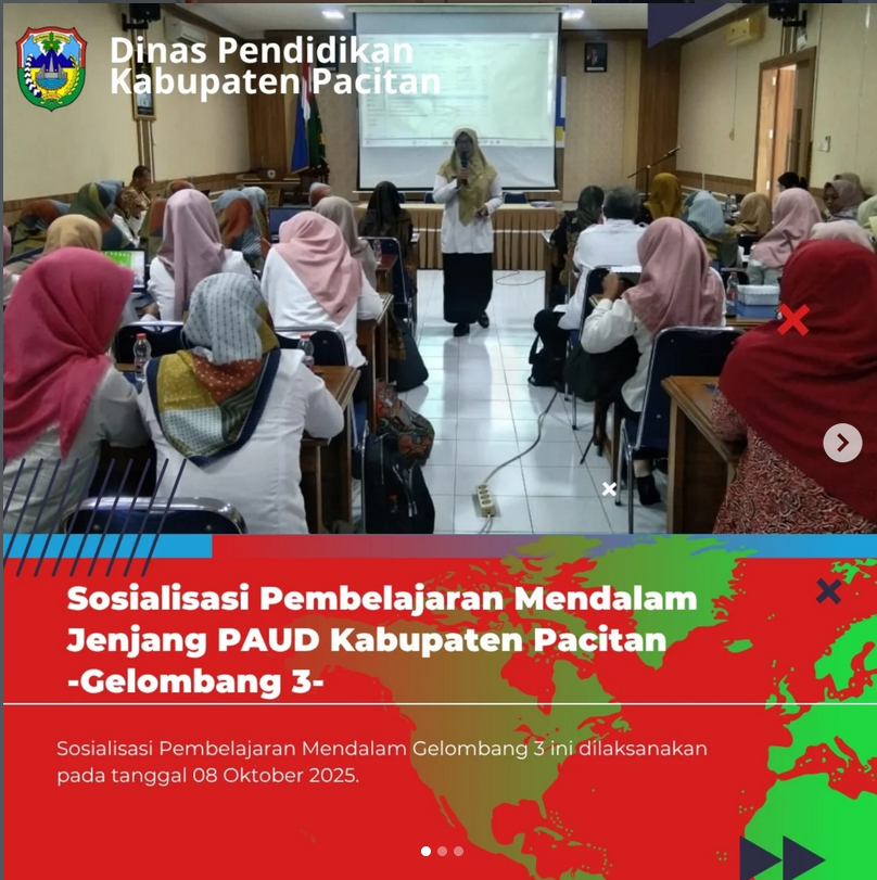 Hallo selamat sore #sobatpedulipendidikan #sobatpendidikan #sobatpejuangpendidikan Selasa (07/10/2025) Dinas Pendidikan Kabupaten Pacitan melalui Sub Kurikulum Bidang Pembinaan PAUD dan PNF menyelenggarakan kegiatan Sosialisasi Pembelajaran Mendalam Jenjang PAUD Kabupaten Pacitan Gelombang…